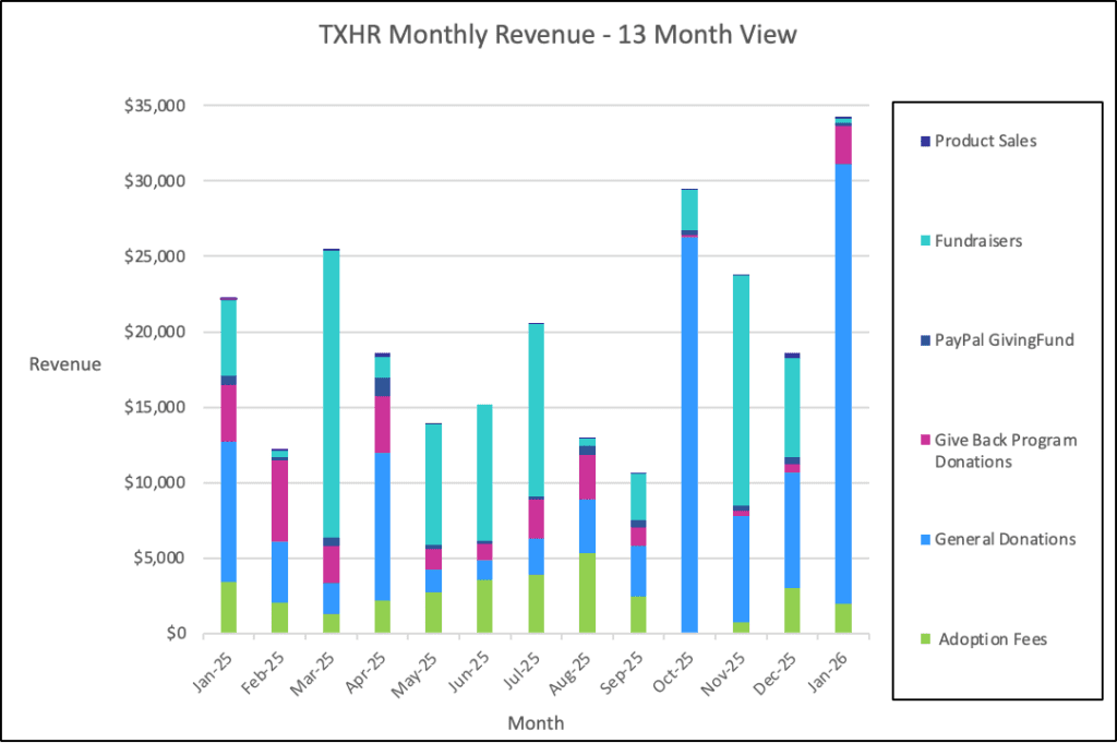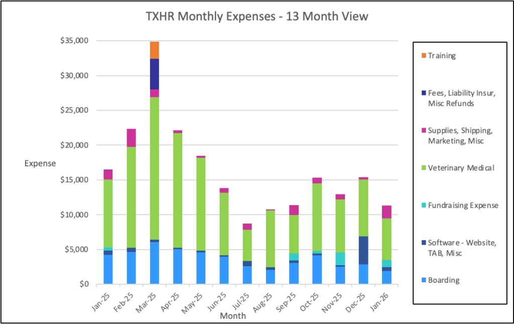 Our expenses were $202,624.13, primarily for boarding and medical needs. March was our toughest month, as that was when the medical costs for the Parvo pups hit our account. Their story is told at https://texashuskyrescue.org/2025/03/24/parvo-puppies-2025-edition/